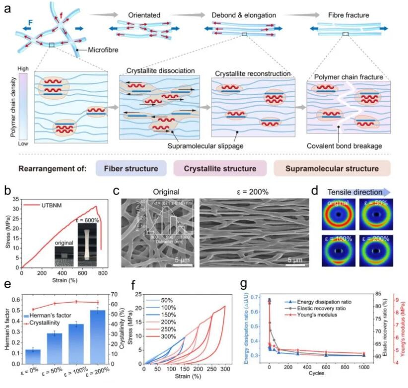 UTBNM断裂过程分为三阶段(图3a):1)取向重组阶段(应变<200%):纤维网络解离,弱氢键断裂耗能(图3c);2)拉伸强化阶段(应变200%-600%):分子链密排诱发新结晶域,广角X射线衍射(WAXD)显示结晶度与赫尔曼因子持续上升(图3d-e);3)临界断裂阶段:超分子网络不可逆解离。材料韧性达102.13 MJ /m³(图3b),1000次循环拉伸后能量耗散率稳定在0.3,形变恢复率>60%(图3g),且无折叠痕迹,表明优异抗疲劳性。