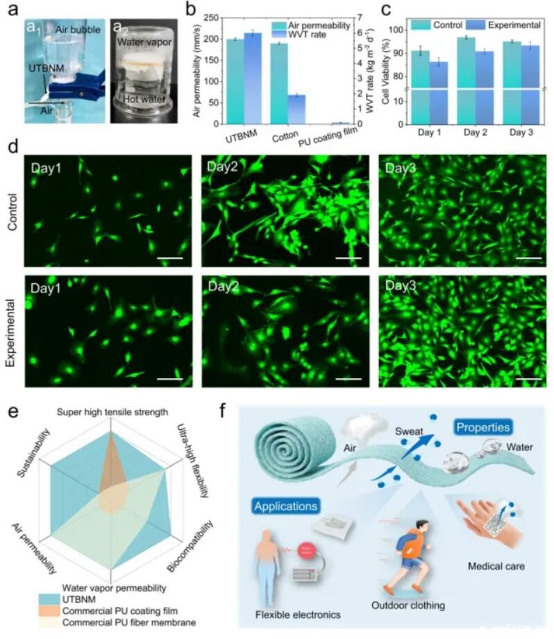 UTBNM兼具透气性(200 mm/s)与透湿性(6 kg·m⁻² ·d⁻¹),分别为商业PU涂层膜的100倍和60倍(图4a-b)。生物相容性测试显示,人骨肉瘤细胞(Saos-2)存活率>90%(图4c),活死染色证实细胞增殖良好(图4d)。综合性能超越传统PU材料(图4e),适用于智能纺织、柔性电子及医疗领域(图4f)。