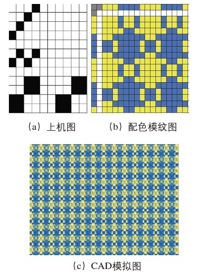 图 1 上机图、配色模纹图及CAD模拟图