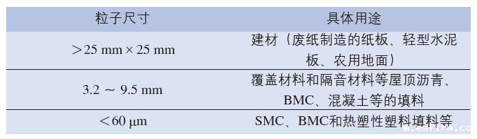 机械回收法通过破碎分选热固性复合材料,获得纤维和树脂粉末,可降级用于填料等。热固性复合材料粉碎成不同粒径后的具体用途如表所示。
