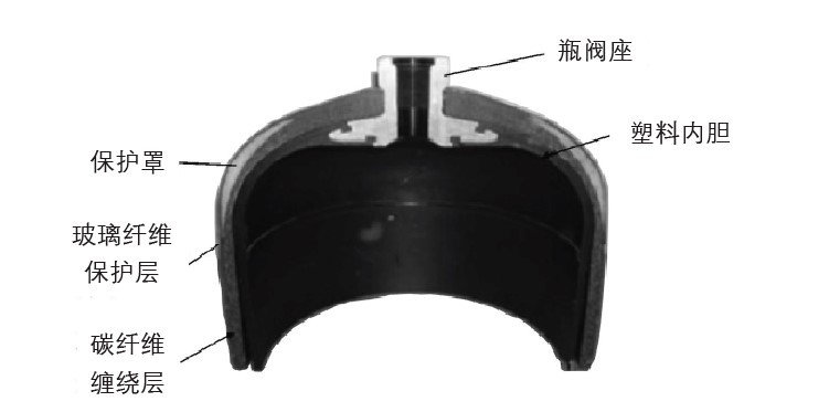 以下以IV型碳纤维氢气瓶为代表对其进行介绍。IV型碳纤维氢气瓶结构分为瓶阀座、塑料内胆、保护罩、碳纤维缠绕层和玻璃纤维保护层。其中瓶阀座是压力释放阀的重要组成部分;塑料内胆用于储存充入的高压氢气,主要起到密封作用,同时能够为碳纤维缠绕层提供支撑;保护罩用于保护气瓶免受外界机械冲击、碰撞等损伤,防止气瓶表面出现划痕、凹陷等缺陷,并在一定程度上密封内部氢气,防止泄露,确保气瓶的完整性和安全性。碳纤维缠绕层一般是由碳纤维和环氧树脂构成,能够承受高压氢气的作用力,确保气瓶安全可靠;玻璃纤维保护层则是为了保护碳纤维缠绕层而设置,一般由玻璃纤维和环氧树脂制成,进而保证气瓶强度以避免气瓶受损或破裂。