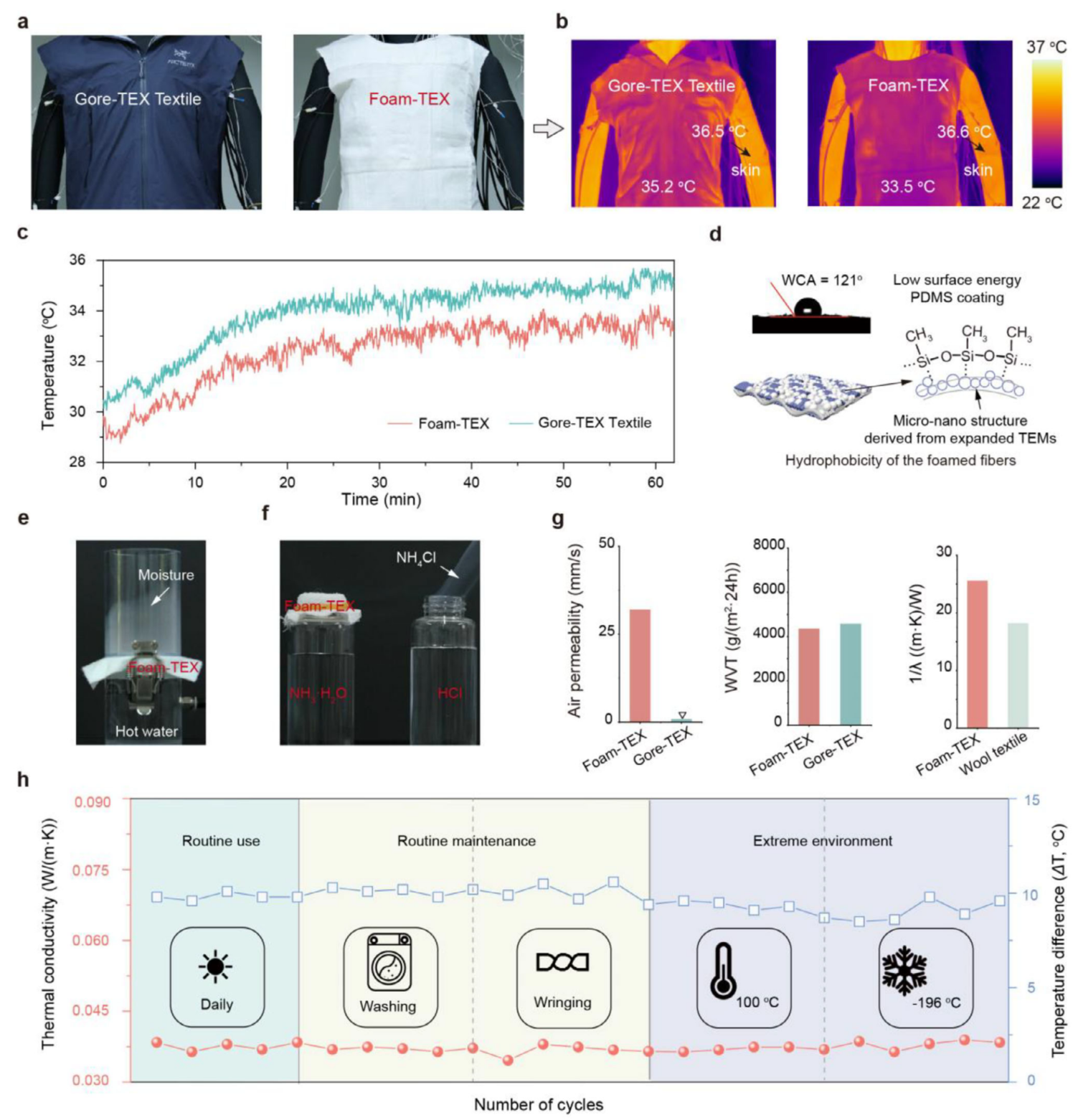 进行穿戴测试,穿着Foam-TEX的假人表面温度(33.5 ℃)显著低于商用Gore-TEX(35.2 ℃)(图3a-c)。泡沫纤维的微纳结构与PDMS甲基赋予织物超疏水性(图3d),而分级孔隙则保障透气性——水蒸气可穿透织物冷凝(图3e),氨气扩散后能与盐酸形成白雾(图3f)。测试证实其透湿率>4000 g/(m²·24h),防风透湿等级达FZ/T 01149-2019标准二级(图3g)。即便经历液氮(-196 ℃)、沸水(100 ℃)或机洗,保温性能仍保持稳定(图3h)。