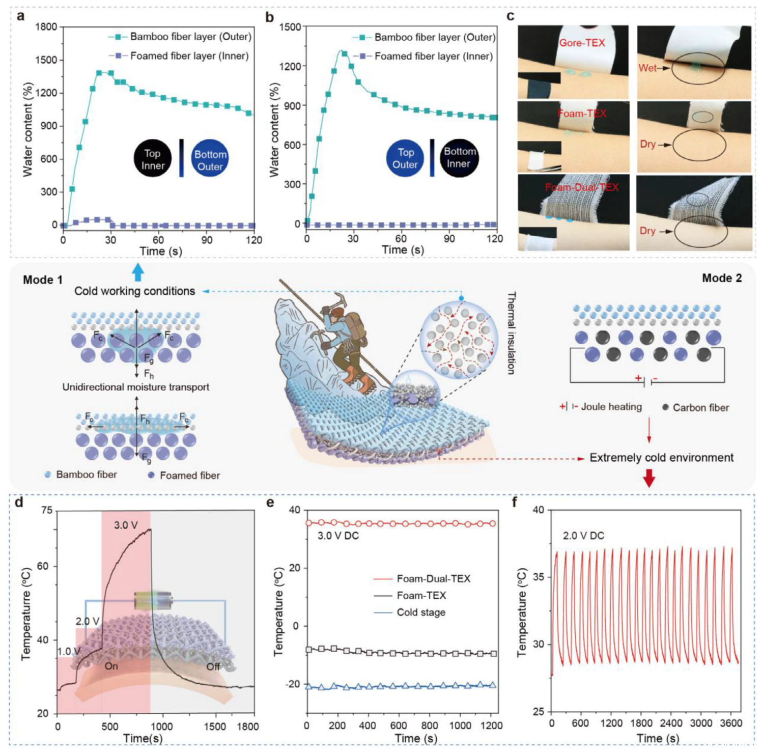 单向导湿测试表明:当发泡纤维层朝上时,汗液被快速导向竹纤维层(图4a);竹纤维层朝上时则阻止水分外渗(图4b)。模拟出汗实验中,Foam-TEX表面无液滴残留,而Gore-TEX出现明显积汗(图4c)。为进一步强化极寒防护,团队引入碳纤维开发Foam-Dual-TEX,在保留单向导湿能力的同时集成焦耳加热功能。仅需3 V电压,即便在-20 ℃环境中织物表面也能维持37 ℃舒适温度(图4d-e),且循环稳定性优异(图4f)。