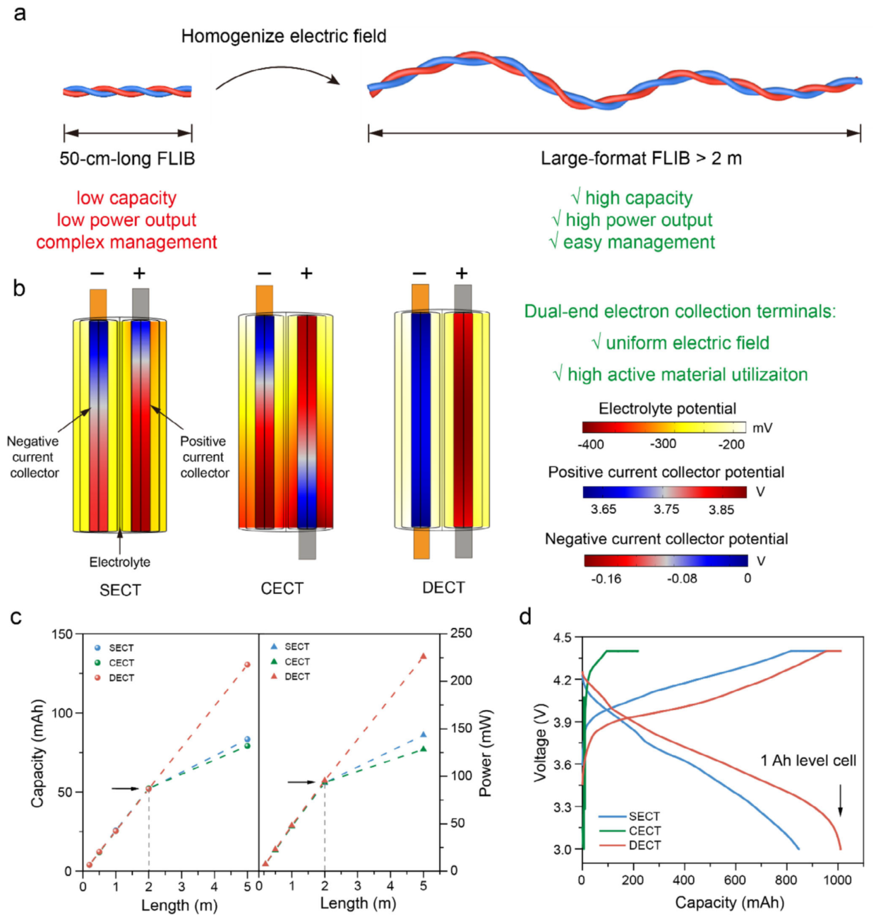传统单端(SECT)或对端(CECT)设计在电池长度超过2米时,因电子传输路径延长导致电场梯度加剧,容量与功率骤降(图1c)。而DECT设计通过在纤维两端设置平衡集电点,使5米长电池的电位分布呈对称最小梯度(图1b),容量与功率随尺寸线性增长。实验表明,10米长DECT电池充放电曲线稳定,容量达1011mAh(图1d)。