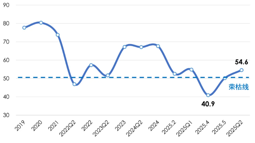 2025年上半年,世界经济复苏乏力,单边主义、保护主义加剧,多边主义、自由贸易受到严峻挑战;国内经济运行总体平稳、稳中向好,在复杂多变的国内外环境中展现了强大的韧性和活力。我国产业用纺织品行业克服了国内外多重不利因素影响,保持了稳中有进的态势。根据协会调研,2025年上半年我国产业用纺织品行业的景气指数为54.6,处于微景气区间(图1)。