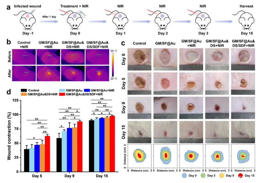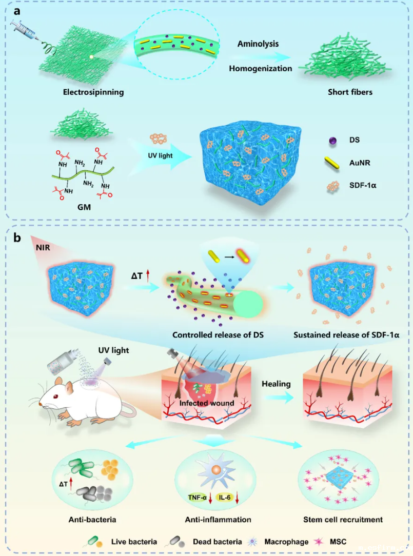 该研究通过将载有金纳米棒(AuNRs)和抗炎药物双氯芬酸钠(DS)的聚乳酸-羟基乙酸共聚物(PLGA)电纺短纤维嵌入基质细胞衍生因子1α(SDF-1α)固定的明胶甲基丙烯酰胺(GelMA)水凝胶中,构建出一种多功能喷雾敷料。该系统具备光热抗菌、按需抗炎药物释放和持续招募干细胞的能力,显著改善了感染伤口的微环境,加速愈合过程。