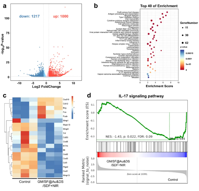 在大鼠金黄色葡萄球菌感染伤口模型中,该水凝胶结合NIR照射能迅速将伤口温度升至50°C,有效清除细菌。治疗15天后,GM/SF@Au&DS/SDF + NIR组伤口几乎完全愈合,组织学染色显示更完整的皮肤结构、更成熟的胶原沉积、更少的炎症细胞(CD68+),以及更多的MSCs(CD90+)和血管(CD31+),表明其具有优异的促愈合能力。RNA测序分析进一步揭示,该治疗可抑制IL-17等炎症相关信号通路,证实其在分子水平上缓解过度炎症反应。