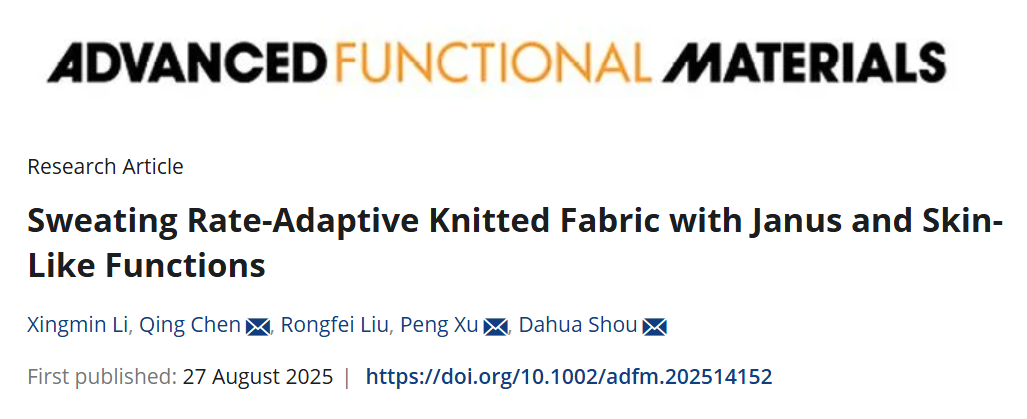 东华大学陈晴副教授、中国计量大学徐鹏教授及香港理工大学寿大华教授合作,研发出一种出汗率自适应的针织面料(Sweating Rate-Adaptive Knitted Fabric, SRAF),成功实现了Janus与类皮肤双功能集成。该研究通过等离子预处理和表面涂层技术,对羊毛/丙烯酸混纺纱线进行润湿性调控,中等疏水纱线的芯吸长度在270秒内相比原纱提高523%,超疏水纱线接触角达150°,且具有良好的耐洗性。该面料在3 mL/h低汗率下可实现单向导水与大面积扩散,在15 mL/h高汗率下则能部分排液,实现自适应汗液管理。相关论文以“Sweating Rate-Adaptive Knitted Fabric with Janus and Skin-Like Functions”为题,发表在期刊《Advanced Functional Materials》上。