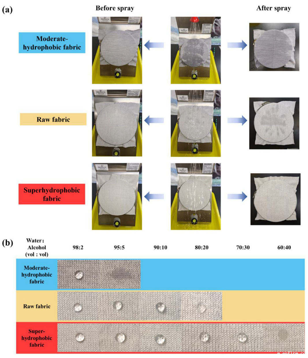 进一步对单一润湿性纱线所编织的面料进行测试,在静态水压实验中,超疏水面料具有最长的进水时间(52.67 s)和最大水压差(36.87 mmH₂O),中等疏水面料则几乎无静水压。抗溅性测试中,超疏水面料获得了最高4级评级,而中等疏水面料抗湿性较差。水/乙醇溶液抗湿实验也验证了超疏水面料对高浓度酒精滴液仍具有良好的排斥能力。
