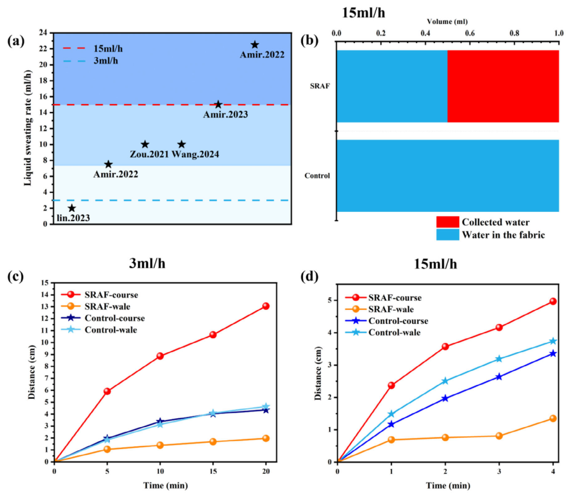 图6. a) 文献中注水速率对比 b) 15 mL/h注水速率下SRAF与对照织物的集水量对比 c) 3 mL/h注水速率下织物正面的润湿长度 d) 15 mL/h注水速率下织物正面的润湿长度