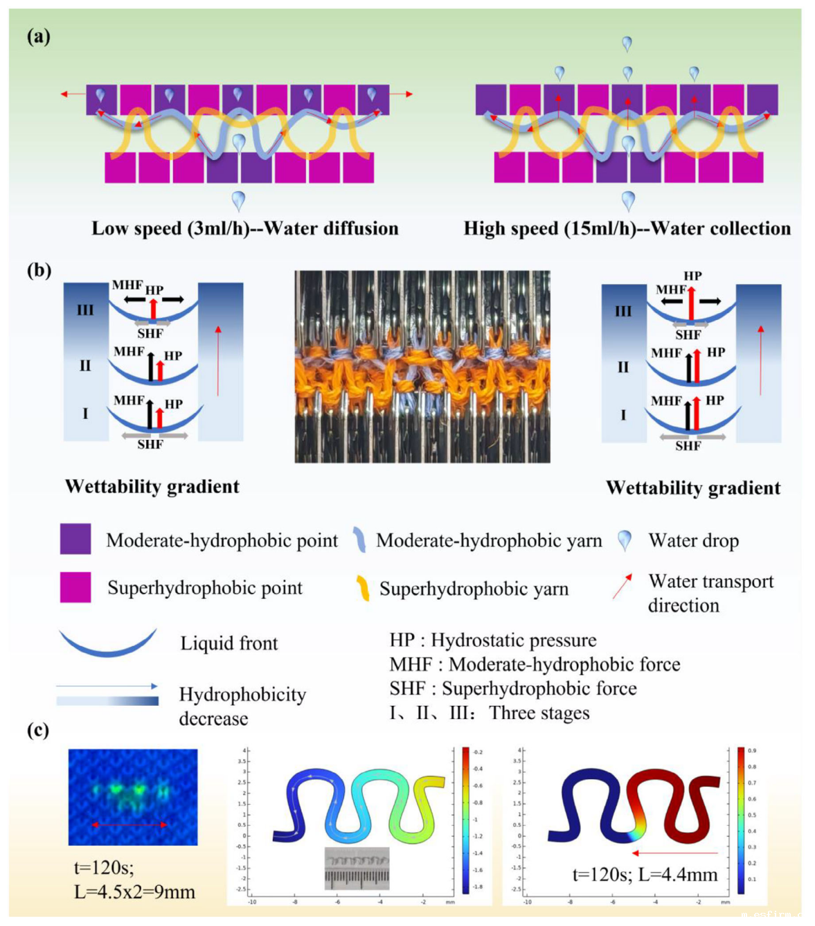 图8. a) SRAF织物的水分传输过程示意图 b) SRAF织物的水分传输原理示意图 c) SRAF织物中单根弯曲纱线的2分钟水分传输实验与模拟对比