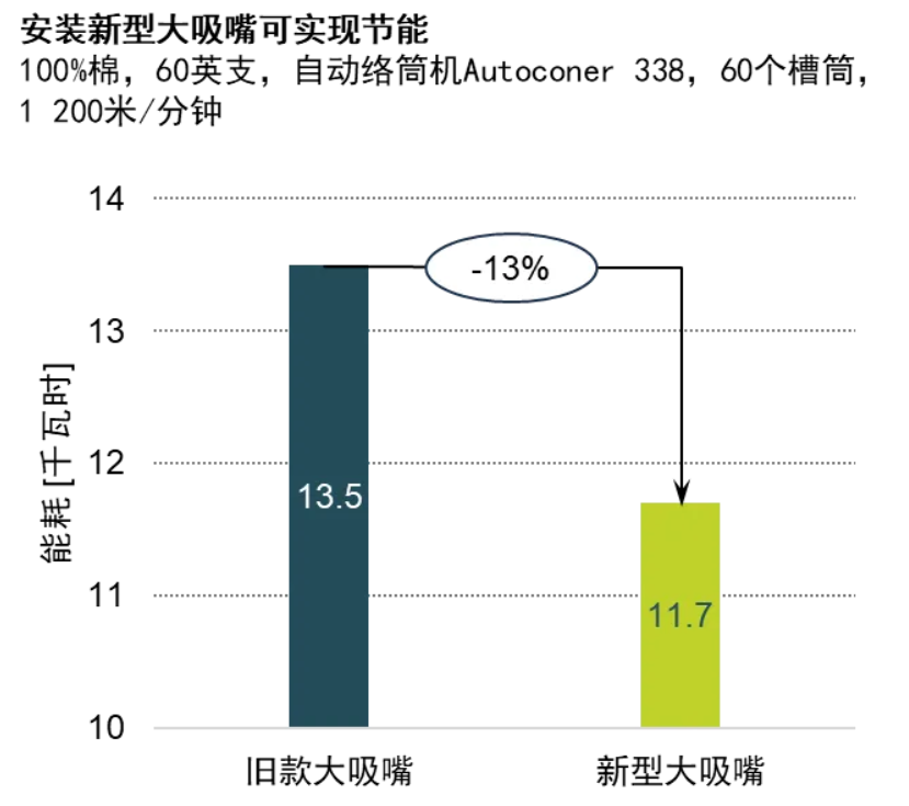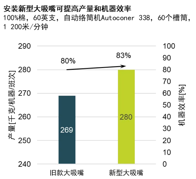 在安装新型大吸嘴后,自动络筒机Autoconer 338的性能大幅提升。升级带来了以下关键优势: