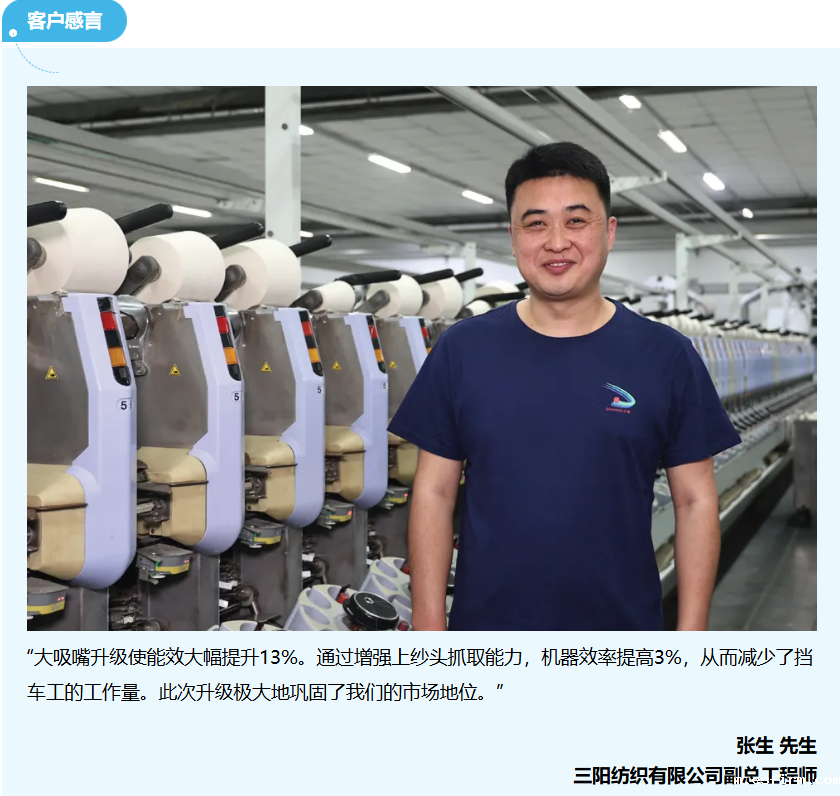 通过升级32台自动络筒机Autoconer 338的大吸嘴,中国三阳纺织有限公司将络筒机纱线产量提高了3%,能耗降低了13%。采用空气动力学设计的大吸嘴优化了气流,能够高效地从卷装上抓取上纱头,红灯率降低了55%,从而大大减少了挡车工的工作量。