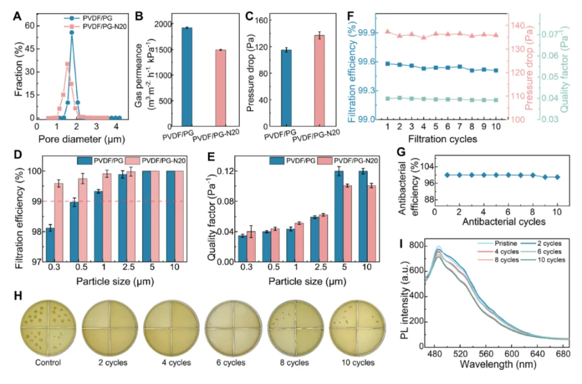 在过滤性能方面,PVDF/PG-N20膜对PM0.3的过滤效率达99.59%,且在高湿度环境下仍保持稳定。经过10次热循环后,其过滤效率仍保持在99.51%,抗菌活性超过99.9%,显示出良好的耐用性和可重复使用性。CFD模拟表明,花苞状结构通过扰动流场、增强布朗扩散和范德华力,显著提升了颗粒捕获效率。