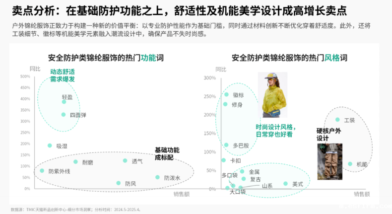 防护功能作为市场基本盘仍重要,但增长动能正在逐渐转向轻量化设计与风格化表达的结合。其中,硬朗的机能风通过“轻便+功能性”切中都市运动场景需求,而低调的静奢风则以“前卫+质感呈现”满足休闲/通勤场景的审美升级。企业可以“轻量化”为开发重点,在“机能运动”与“静奢质感”的风格上开发创新产品。