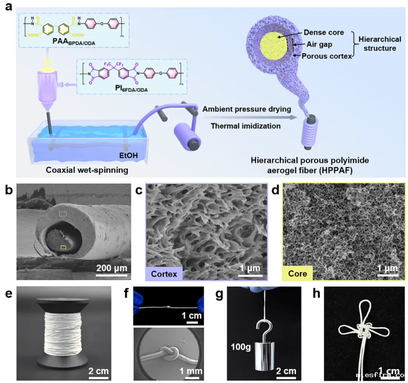 该工作基于同轴湿法纺丝结合常压干燥技术,采用可溶性含氟聚酰亚胺(PI6FDA/ODA)作为皮层纺丝液,聚酰胺酸(PAABPDA/ODA)作为芯层纺丝液,通过同轴针头共挤出至乙醇凝固浴中进行溶剂置换。纤维固化后经卷辊收集,依次进行常压干燥及热亚胺化制得高性能聚酰亚胺气凝胶纤维(HPPAF)。在凝固浴中,由于皮层和芯层纺丝液在溶解度和相分离速率上的差异,HPPAF形成了独特的分级结构:疏松多孔的皮层、致密的芯层以及二者之间的气隙。聚酰亚胺皮层的疏松多孔结构以及气隙确保HPPAF优异的隔热性能,而芯层的致密结构主要提供力学强度,有效解决了聚酰亚胺气凝胶纤维中力学和隔热性能难以兼顾的难题。与此同时,皮层纺丝液中的三氟甲基有效降低了纤维的表面能,使得常压干燥成为可能,实现了气凝胶纤维的高效连续制备。