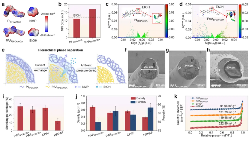密度泛函理论(DFT)模拟揭示了聚合物与溶剂之间的相互作用,基于Hirshfeld分配的独立梯度模型(IGMH),验证了纺丝液进入乙醇凝固浴时,芯层PAABPDA/ODA与乙醇之间表现出比皮层PI6FDA/ODA更强的静电相互作用。含氟聚酰亚胺与乙醇之间较弱的静电和氢键相互作用诱导了快速相分离,使皮层形成多孔结构。相比之下,芯层中高极性指数的聚酰胺酸与乙醇之间相互作用较强。随着乙醇的挥发,纤维内外形成了浓度/压力梯度,拉扯凝胶骨架。这些综合作用驱动聚合物链重组和孔收缩,最终产生了致密均匀的纳米多孔结构。同时,在皮层和芯层之间形成了气隙,从而产生了分级多孔结构,所制备的HPPAF的比表面积高达222.89 m2/g。通过制备不同结构的纤维进行对比实验,进一步验证了分级多孔结构的形成机制。