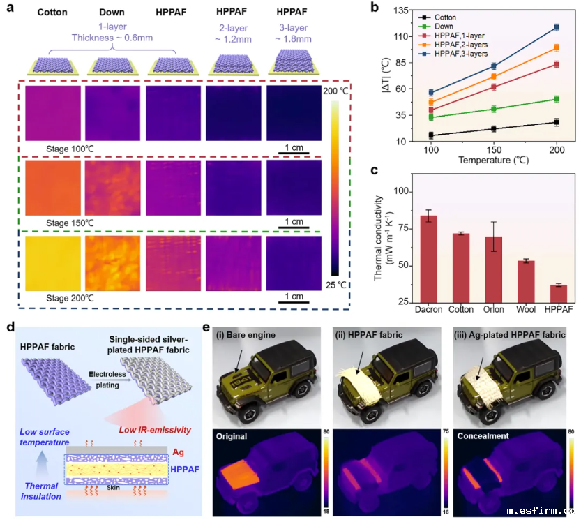 在不同温度下,不同层数的HPPAF织物始终表现出优异的隔热性能。在200 ℃的热台上,三层HPPAF织物的表面温差|ΔT|可达118.4 ℃且保持稳定,显著优于商用织物。经化学镀的方法进行单面镀银,HPPAF织物可在8~14 μm的大气红外窗口中保持低红外发射率;在加热至80 ℃的汽车模型发动机测试中,HPPAF织物成功实现了红外隐身,展示了其在军事伪装领域的潜在应用价值。