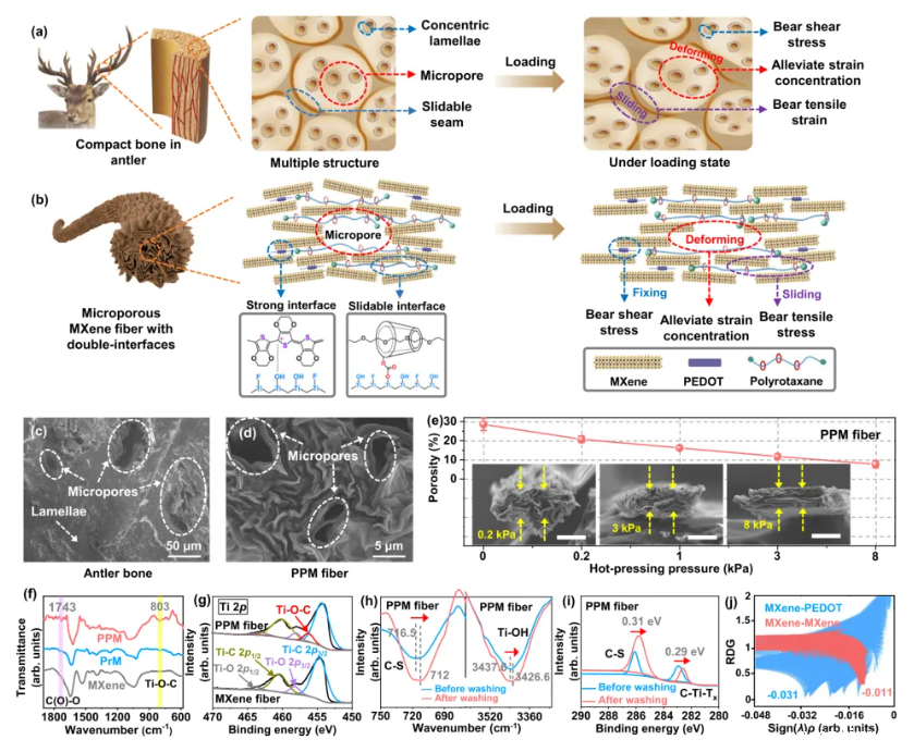 研究团队通过湿法纺丝、洗涤、交联和热压等一系列连续工艺,制备出具有微孔结构和强韧-滑动双界面的MXene纤维(PPM纤维)。如图1所示,其设计灵感直接来源于鹿角(图1a)的紧凑骨骼结构,该结构包含高矿化接缝和由同心层状骨板包围的多孔结构(图1c)。仿生的PPM纤维(图1b,d)呈现出类似的微孔和层状结构。通过调控热压压力(图1e),可以精确控制纤维的孔隙率,从28.5%降至7.7%。光谱分析(FT-IR, XPS)证实了MXene与聚轮烷之间形成了机械互锁的滑动界面(图1f,g),以及与PEDOT之间通过静电相互作用形成的强界面(图1h,i)。理论计算(图1j)进一步表明,MXene-PEDOT界面间的静电相互作用远强于MXene层间的氢键,为纤维增强提供了基础。