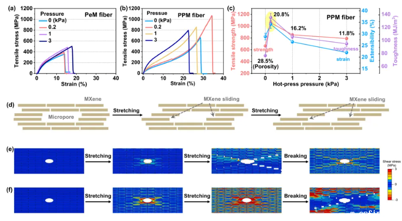 有趣的是,研究团队发现微孔结构并非总是缺陷。如图3所示,对于具有双界面的PPM纤维,存在一个最优孔隙率(约20.8%),此时纤维的强度、韧性和延展性均达到峰值(图3a-c)。这些微孔(图3d)不仅降低了纤维的刚度,增加了柔软度,还为MXene纳米片的滑动和对齐提供了空间,有助于缓解内部应力集中。有限元模拟(图3e,f)对比了具有可滑动界面与非可滑动界面的层状多孔纤维在拉伸载荷下的应力分布,结果表明,可滑动界面模型能在孔洞周围发生界面滑动,从而释放应力,使层状结构在较大变形范围内仍保持承载能力;而非可滑动界面模型则因应力高度集中而易导致结构快速失效。
