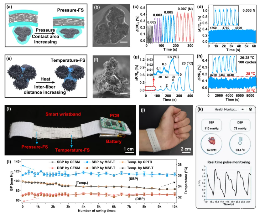 基于A-PPM纤维优异的机电性能,研究团队成功开发了用于智能纺织品的两种传感器:压力传感纤维(Pressure-FS)和温度传感纤维(Temperature-FS)。Pressure-FS(图5a-d)通过电容变化检测压力,具有快速响应、高线性度和超过1000次循环的耐久性。Temperature-FS(图5e-h)则通过电阻变化监测温度,精度可达0.1°C,并在多次热循环中保持稳定。将这些传感纤维与电路、电池集成,制成了智能腕带(图5i-k),能够实时、无创地监测人体动脉脉搏波形、血压和皮肤温度等多种生理信号(图5l)。在与商用医疗级设备的对比中,该腕带显示出极高的准确性和可靠性,并在长时间剧烈运动测试中证明了其鲁棒性和耐用性。